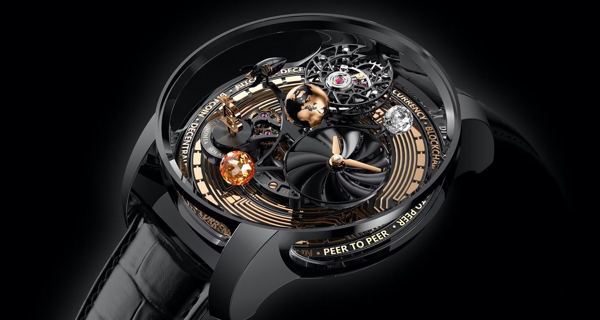 The watch is rich with complications, featuring no less than 444 elements. These elements are set across two rotating platforms, which are adorned with artistic references to crypto and its journey from financial outlier to mainstream payment.